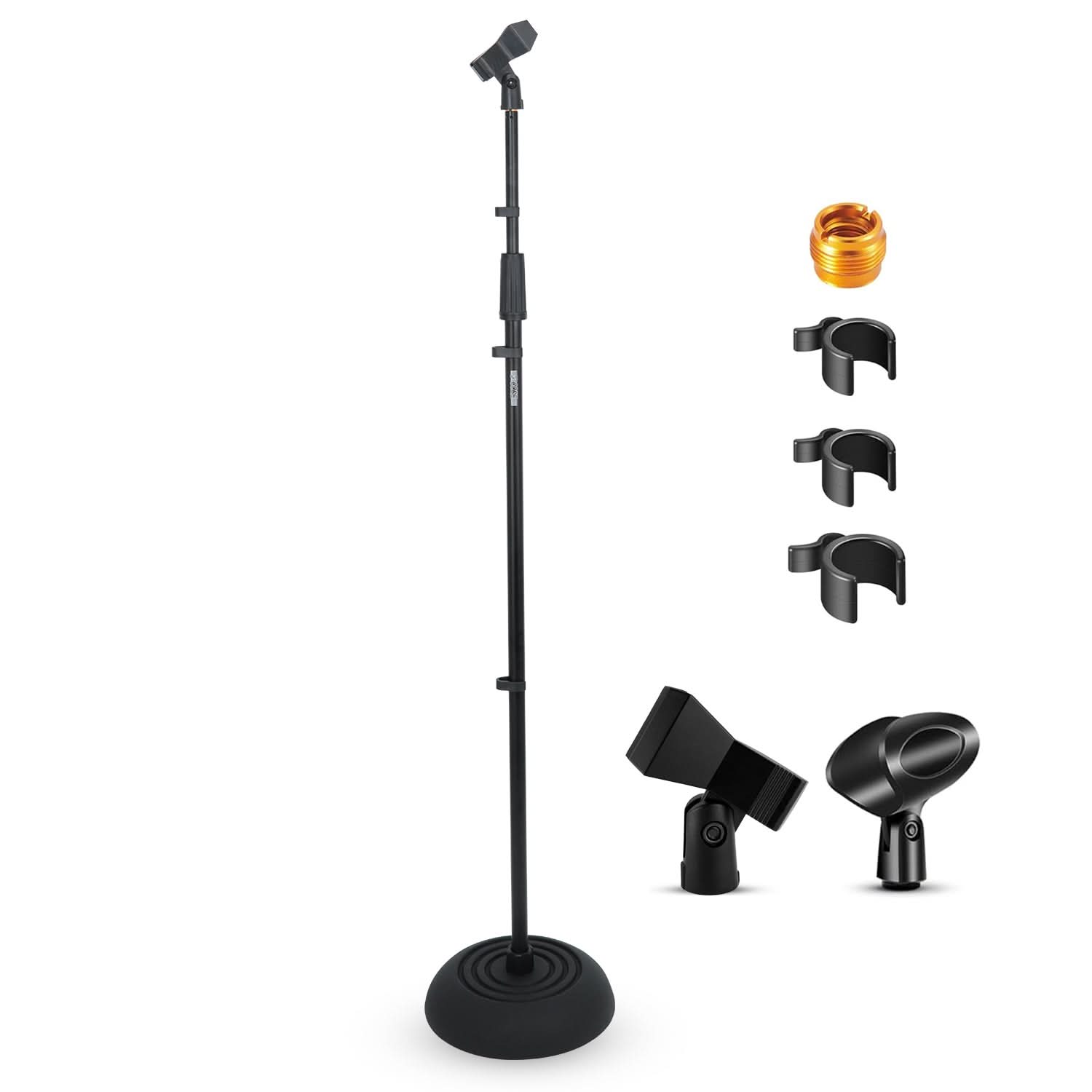 | The microphone stand disassembles and is set up in minutes. It is very easy to carry and store in smaller places. | The mic stand comes with 3 wire clips. It helps to eliminate loose cables and tidy up setup. Also reduce any trip hazard. | The round floor base plate has nonslip rubber padding; it ensures stability and no scratches or marks on the floor. |